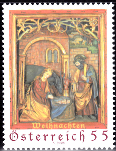 Eine Weihnachtsmarke 2007 aus Österreich (MiNr 2692) zeigt "Christi Geburt" nach einer Ikone aus der St.-Barbara-Kirche in Wien.