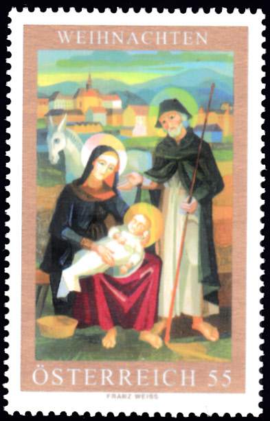 Diese Marke aus Österreich (MiNr 2625) erschien zu Weihnachten 2006 und zeigt das Gemälde "Heilige Familie" von Franz Weiß (1921–2014; Maler und Bildhauer).