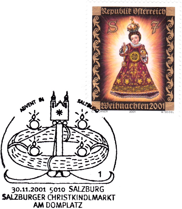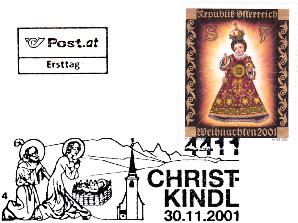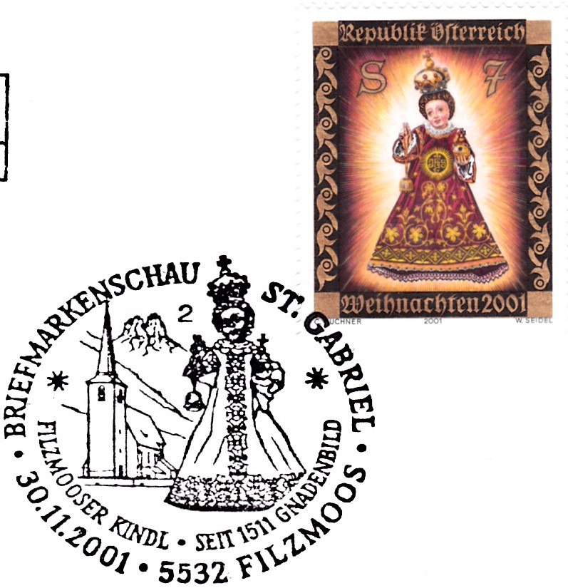 Die Weihnachtsmarken 2001 aus Österreich (MiNr 2362) zeigt das "Filzmooser Kindl", eine Holzfigur aus der St.-Peters-Kirche in Filzmoos. Hier zeige ich eine Marke mit dem Sonderstempel aus Christkindl vom Ersttag.