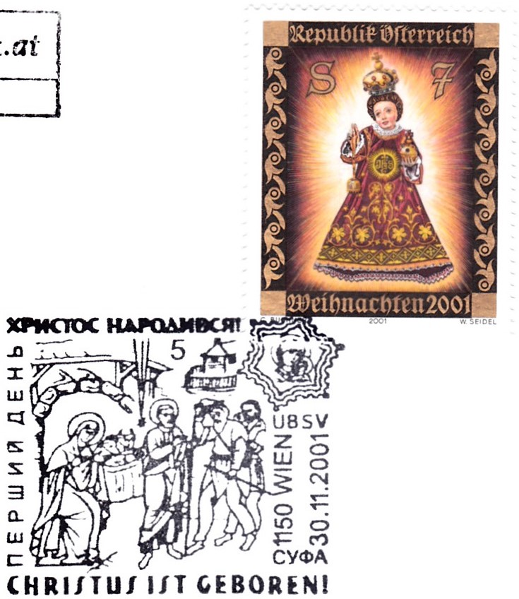 Hier kann ich noch einen Sonderstempel aus Wien zeigen, der für die Stempelung am Ersttag Weihnachtsmarke 2001 eingesetzt wurde.