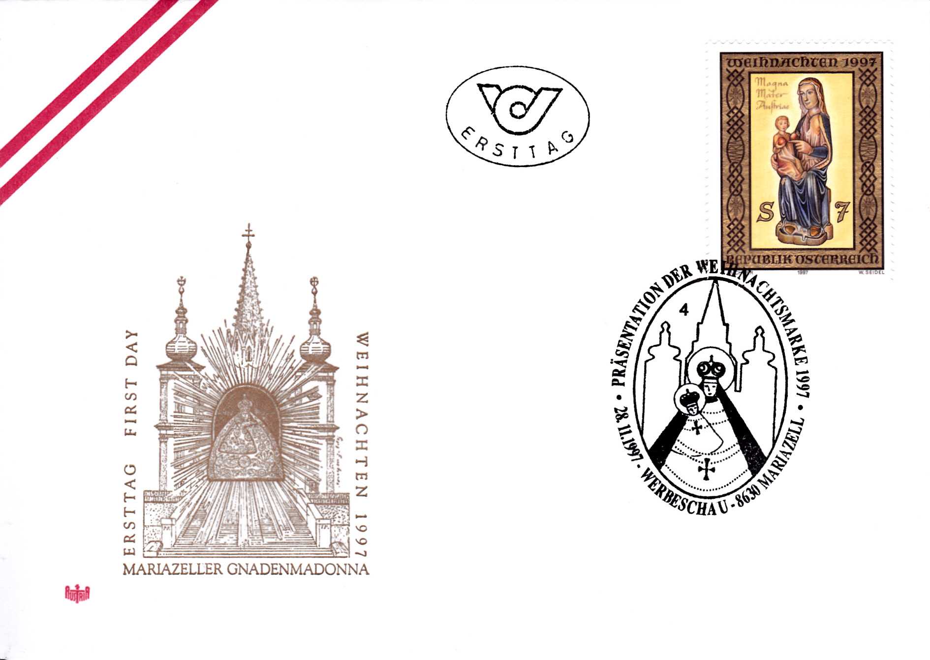 Die Weihnachtsmarke 1989 aus Österreich (MiNr 1977) zeigt ein Detail aus dem Gnadenbild von Johann Carl von Reslfeld am Marienaltar der Pfarrkirche Christkindl.