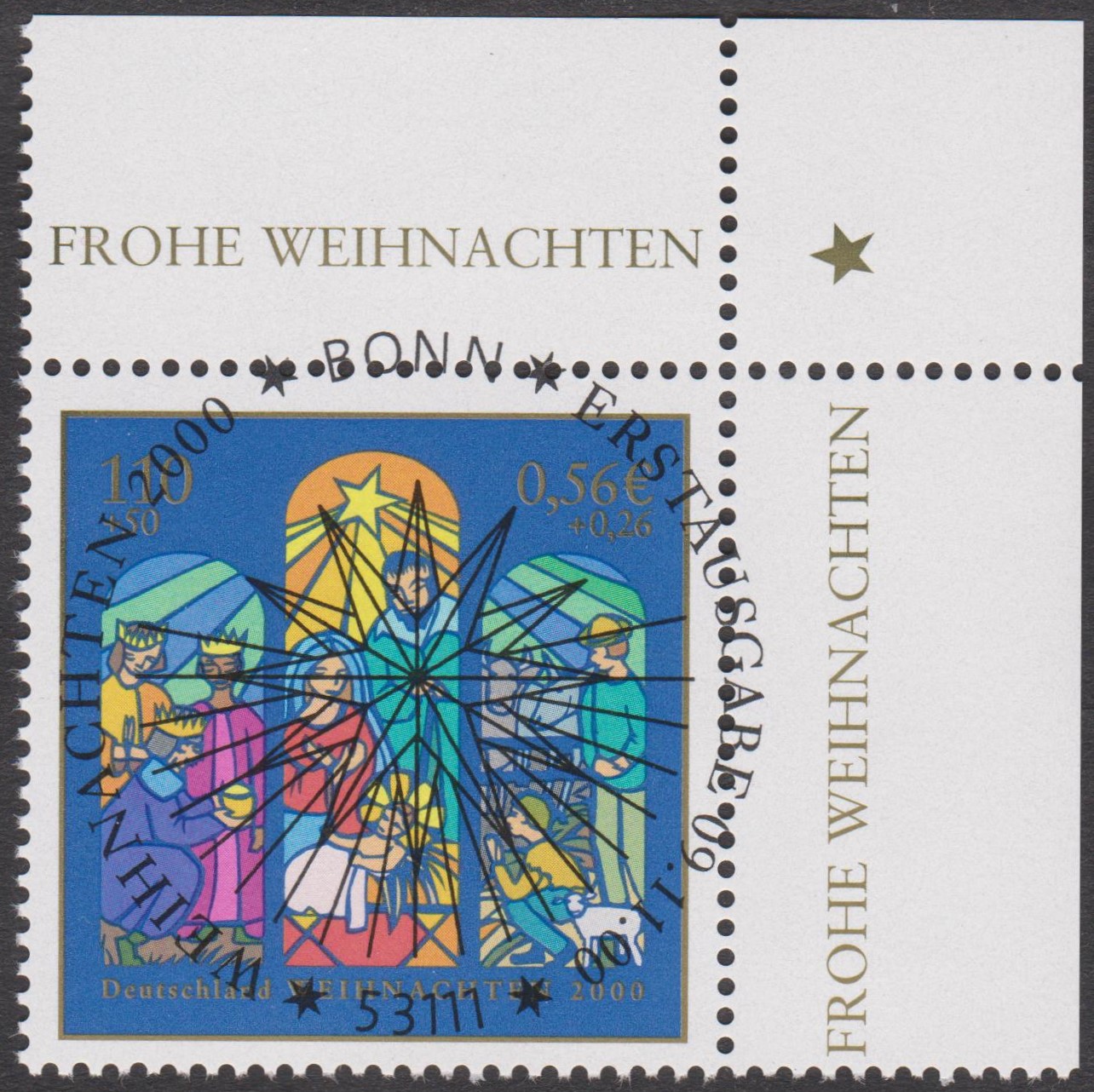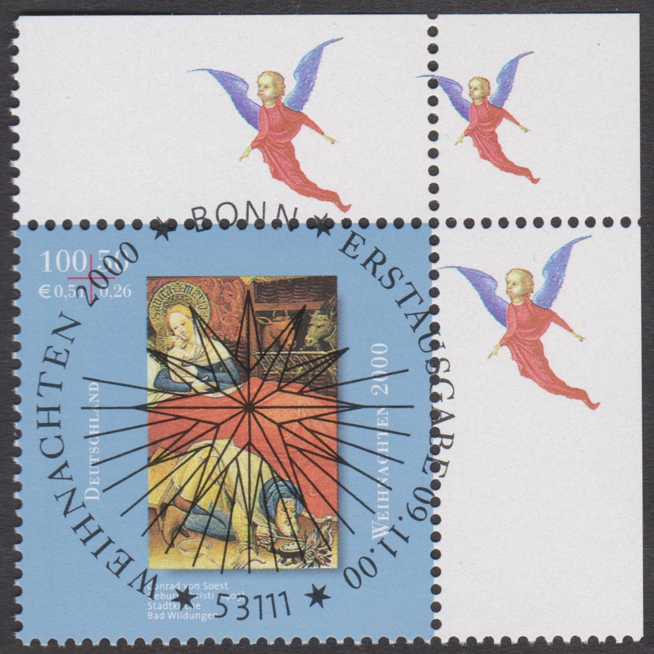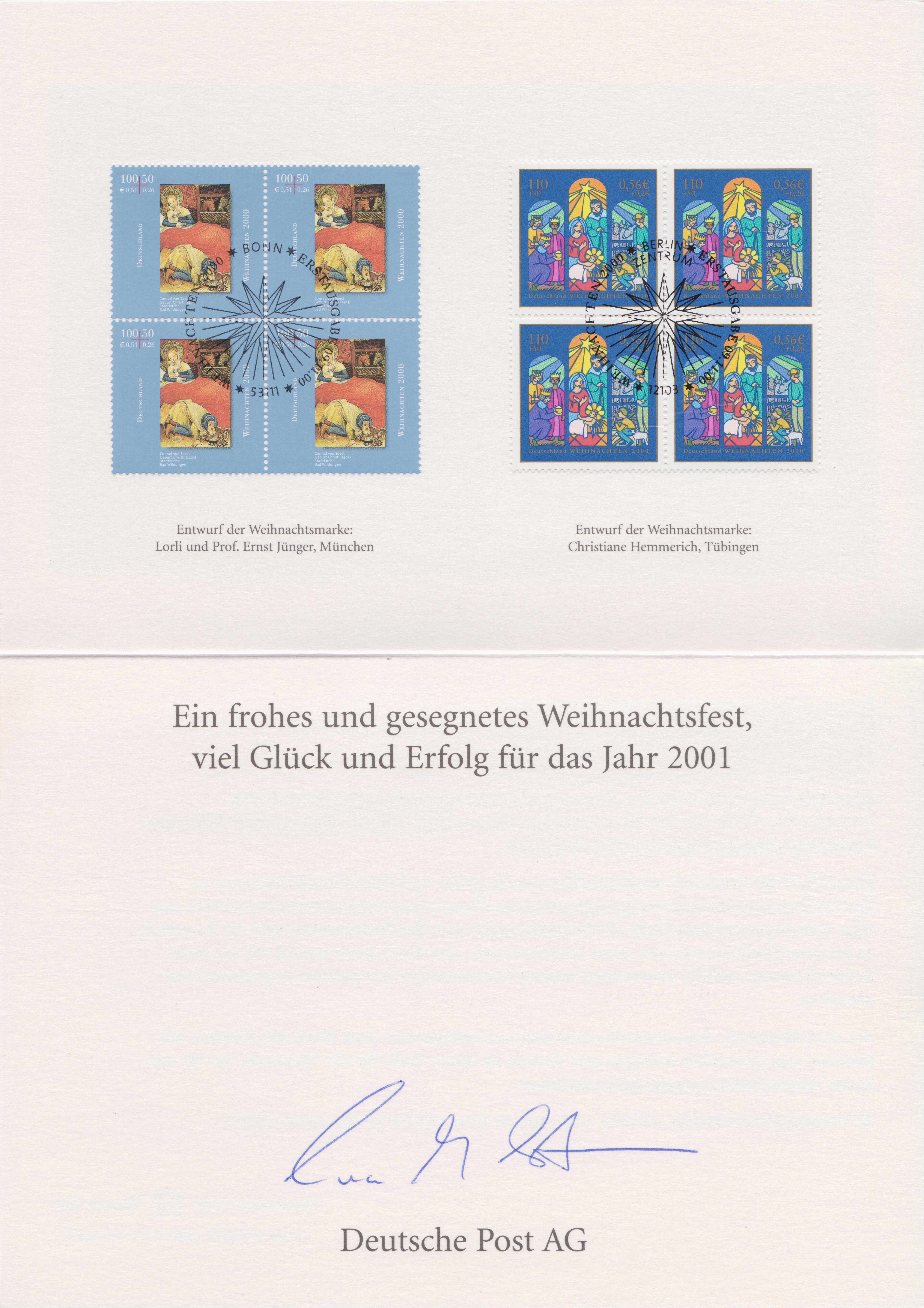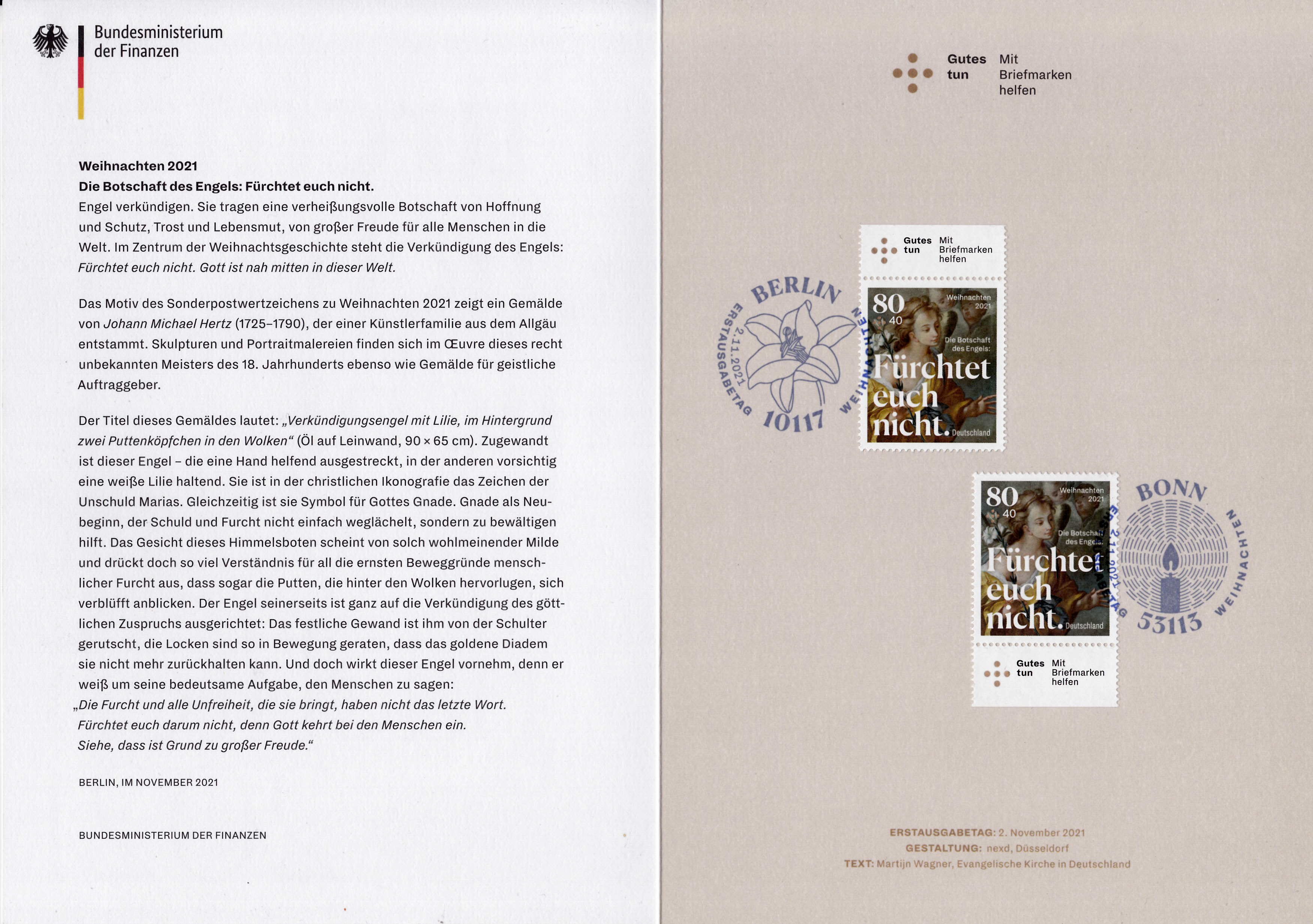 Farbige Ministerkarte des Finanzministers mit zwei Weihnachtsmarken 2021 (MiNr 3636) mit der Abbildung "Verkündigungsengel mit Lilie, im Hintergrund zwei Puttenköpfchen in den Wolken" nach einem Ölgemälde von Johann Michael Hertz (1725–1790, deutscher Maler) und den beiden Ersttagsonderstempel Bonn und Berlin.