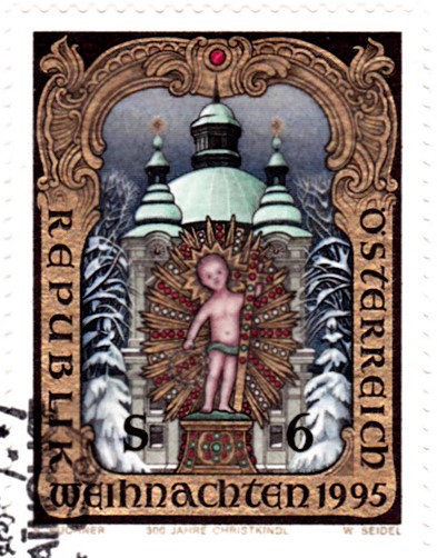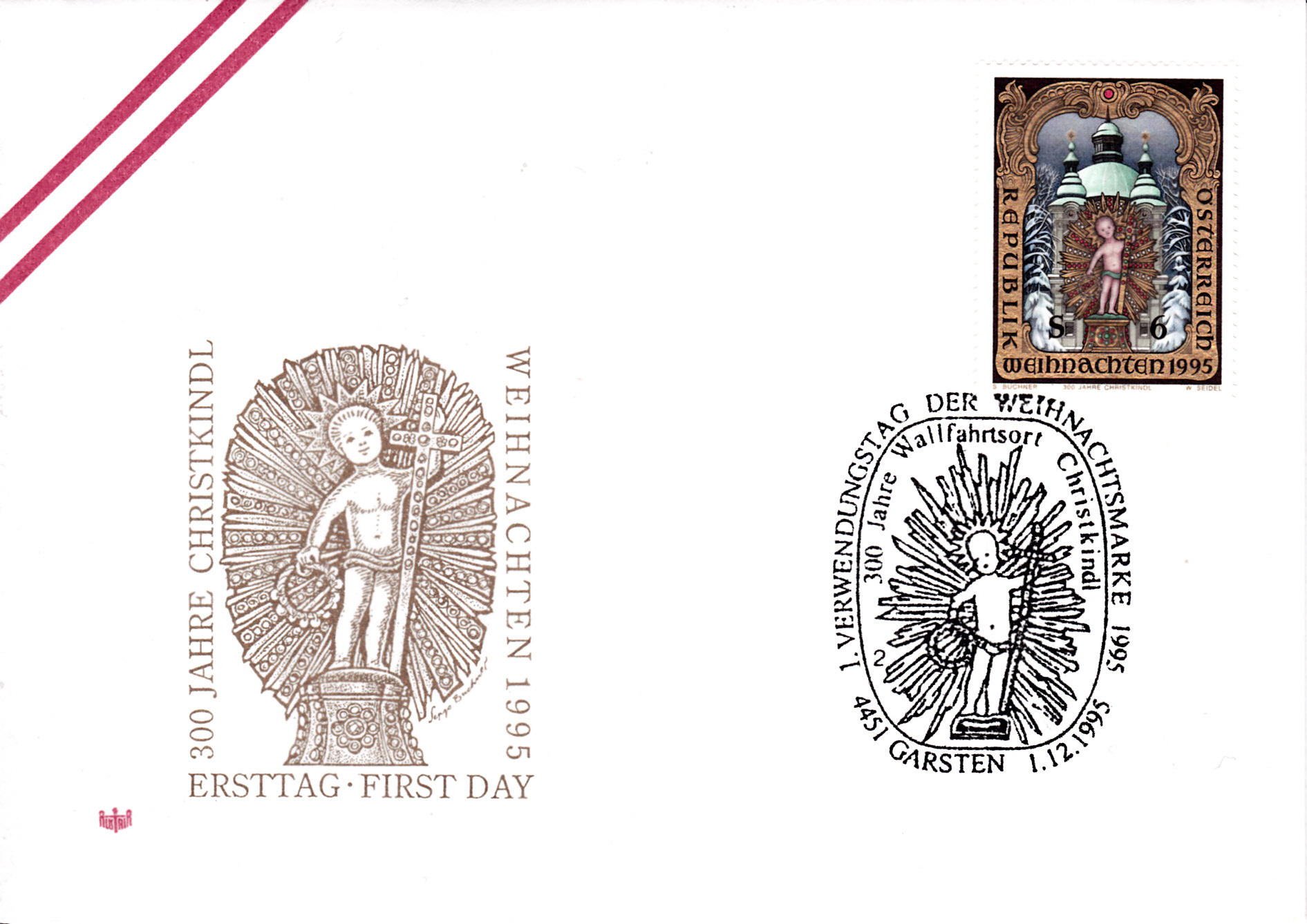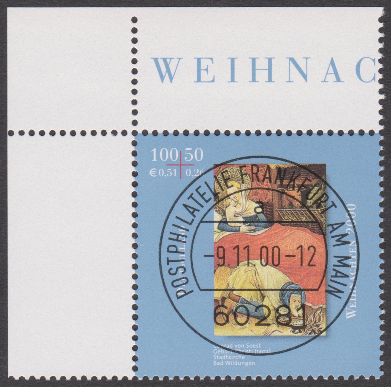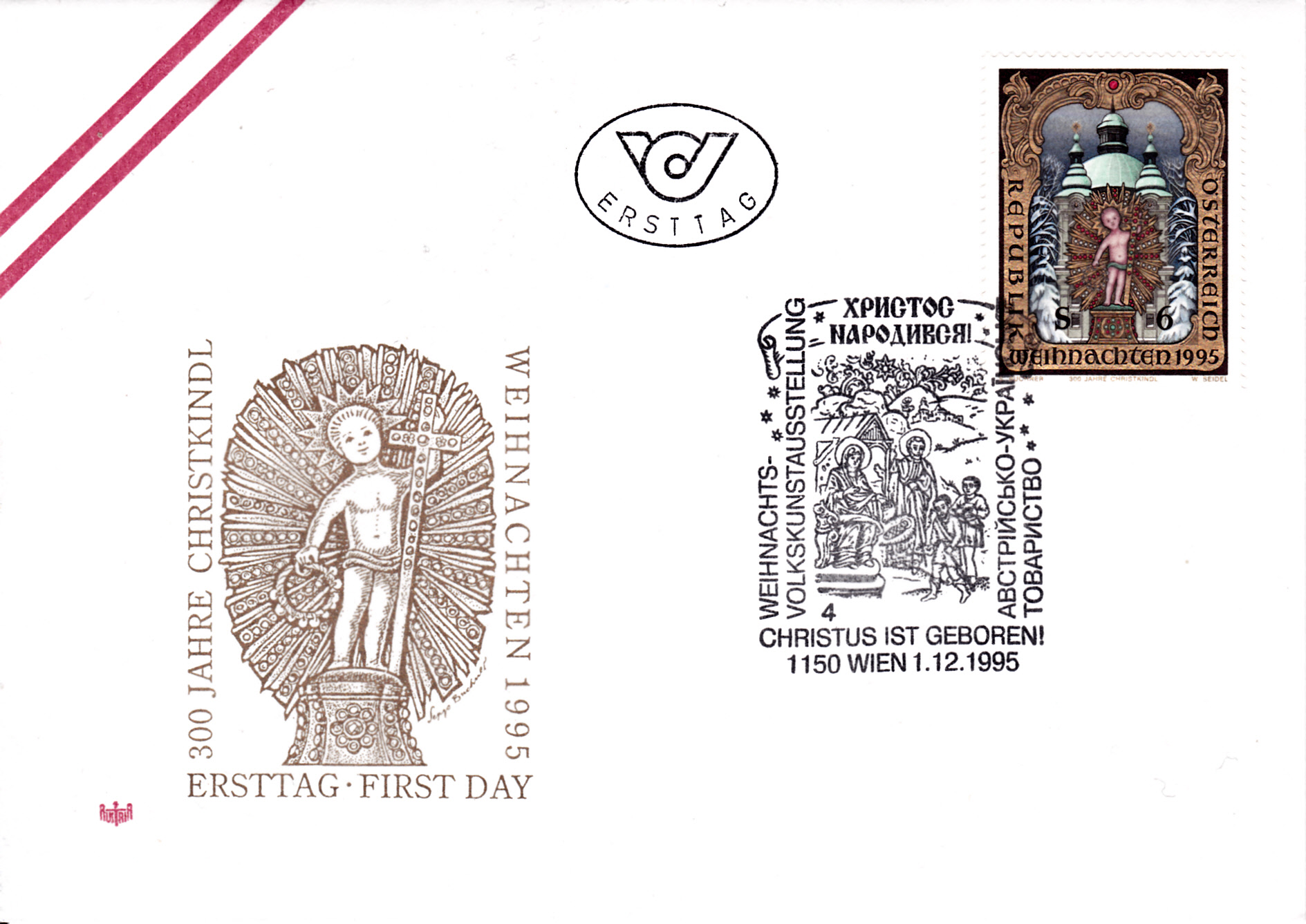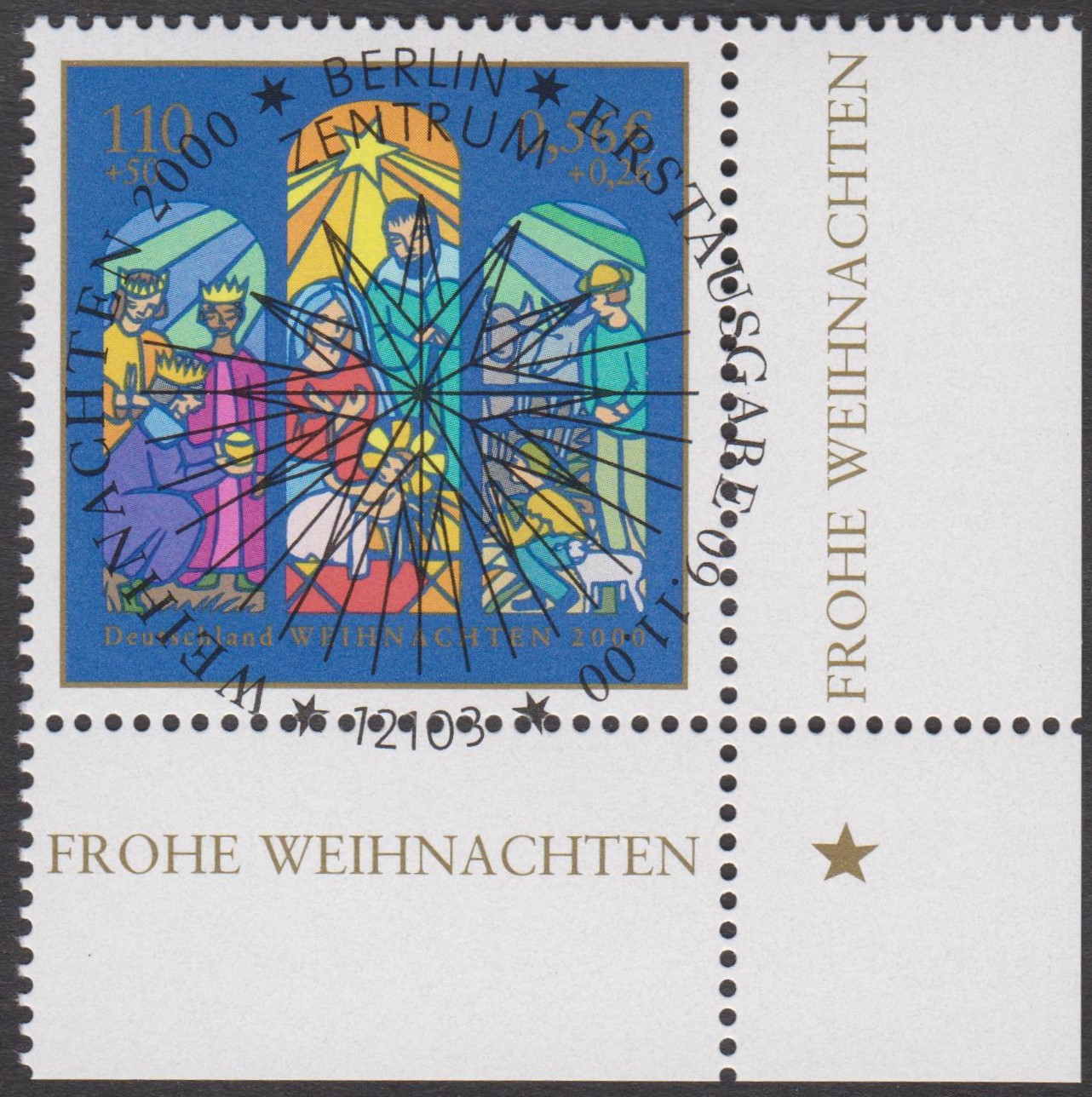 Farbige Ministerkarte des Finanzministers mit zwei Weihnachtsmarken 2021 (MiNr 3636) mit der Abbildung "Verkündigungsengel mit Lilie, im Hintergrund zwei Puttenköpfchen in den Wolken" nach einem Ölgemälde von Johann Michael Hertz (1725–1790, deutscher Maler) und den beiden Ersttagsonderstempel Bonn und Berlin.