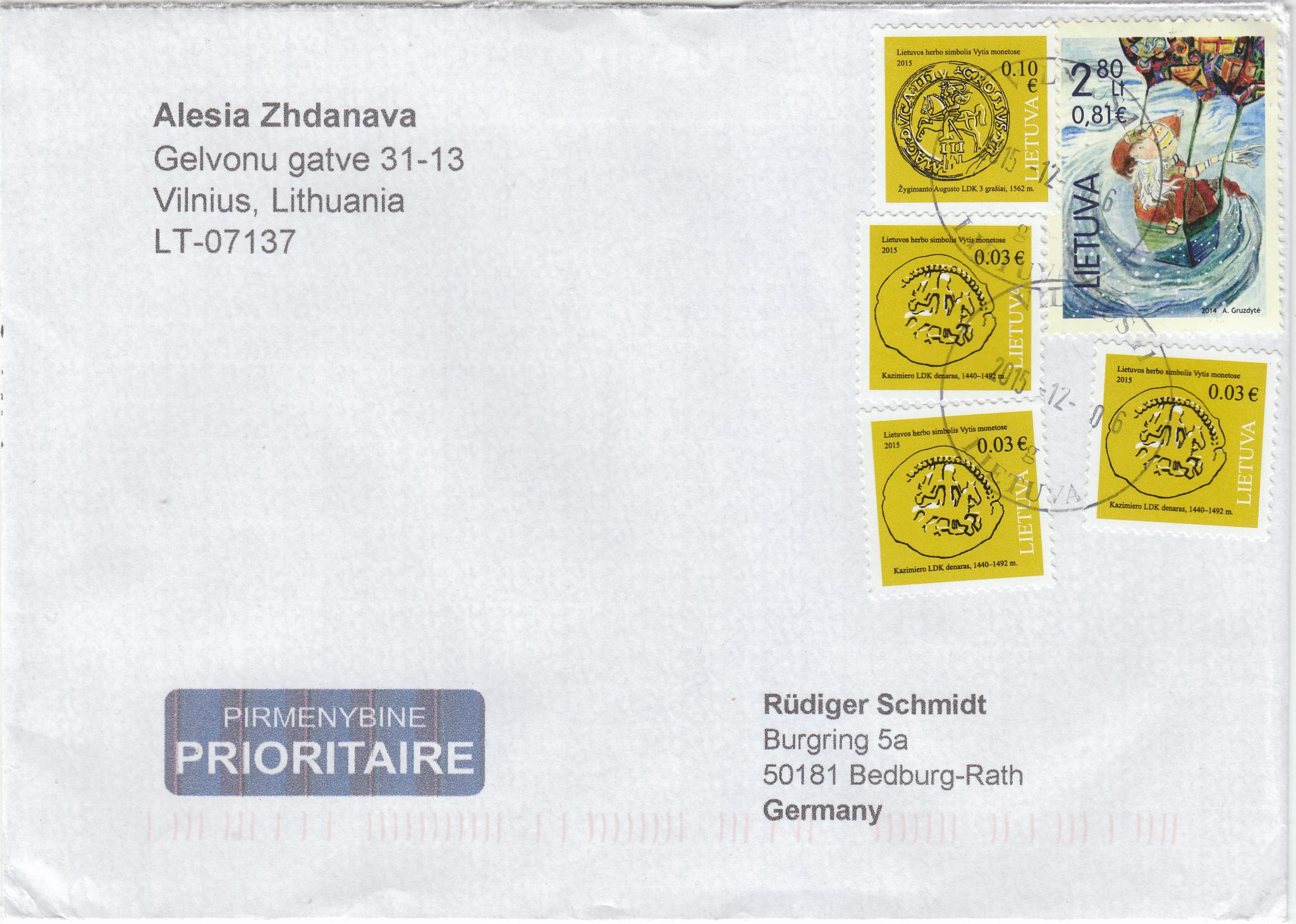 In Litauen erschien 2014 auf einem Postwertzeichen in Doppelnominale als Motiv dieser Weihnachtsmann als Ballonfahrer, hier auf einem Beleg aus meiner Tagespost in Mischfrankatur mit Ergänzungsmarken in Euro-Währung: