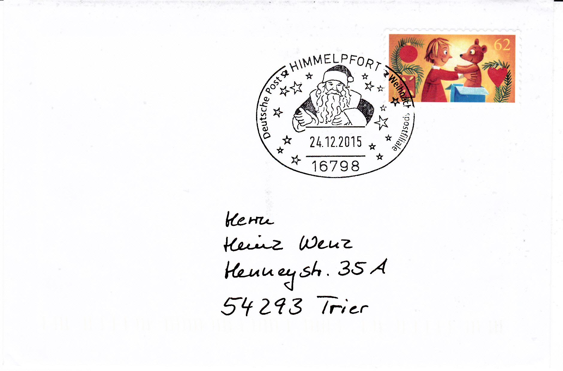 In Himmelpfort gab es auch in diesem Jahr wieder einen Sonderstempel mit dem Nikolaus in der bereits seit Jahren bekannten Darstellung. Es gibt den Stempel mit neun verschiedenen Daten. Hier ein Stempel vom 24.12.2015.
