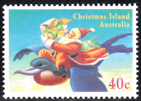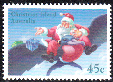 Der Weihnachtsmann wirft über der Weihnachtsinsel Geschenke ab. Dies wird auf der zweiten Weihnachtsmarke der Weihnachtsinsel (MiNr 409) aus dem Jahre 1995 gezeigt.