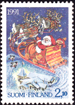 Es gibt noch eine zweite Marke in dieser Ausgabe aus Finnland (MiNr 1160) mit dem Weihnachtsmann im Rentierschlitten.