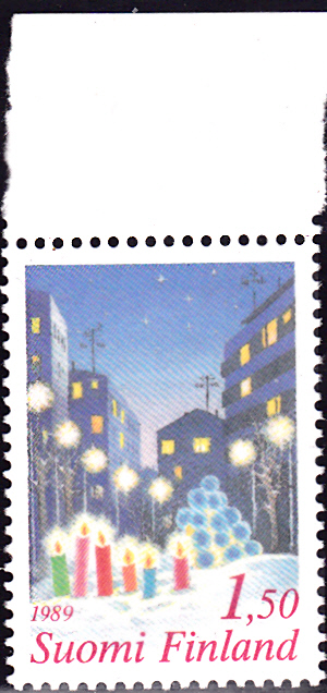 Diese Weihnachtsmarke 1989 aus Finnland (MiNr 1096) zeigt eine weihnachtlich geschmückte Stadt.