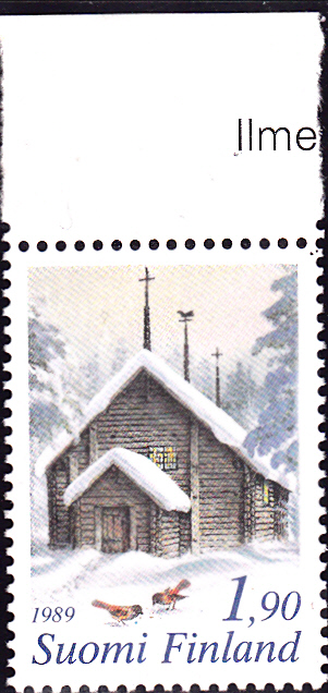 Auf der zweiten Weihnachtsmarke 1989 (MiNr 1097) ist eine Holzkirche in Lappland abgebildet.