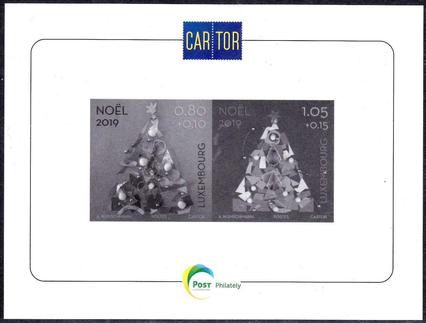 In der Jahreszusammenstellung der Marken aus dem Jahre 2019 der Luxemburger Post wurde ein Schwarzdruck mit diesen beiden Marken beigefügt.