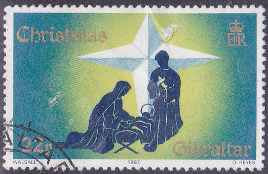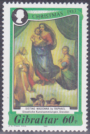Die Weihnachtsmarken 1983 aus Gibraltar zeigten zum 500. Geburtstag von Raffael Gemälde von Raffael. Hier zeige ich die Marke zu 17 Pence (MiNr 473) mit seinem Gemälde "Madonna di Foligno".