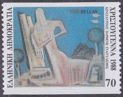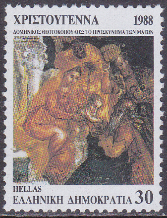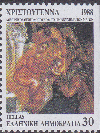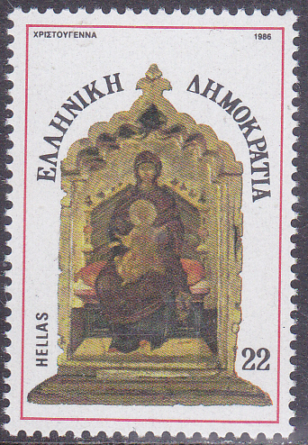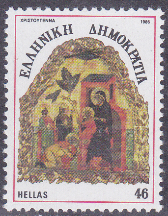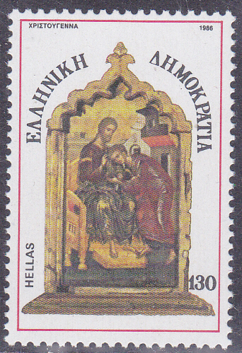 Diese Marke (MiNr 1642) mit "Christus und hl. Johannes d. E." von der Seitentafel einer Flügelikone (15. Jh.) vervollständig die Weihnachtsmarkenserie 1986 aus Griechenland.