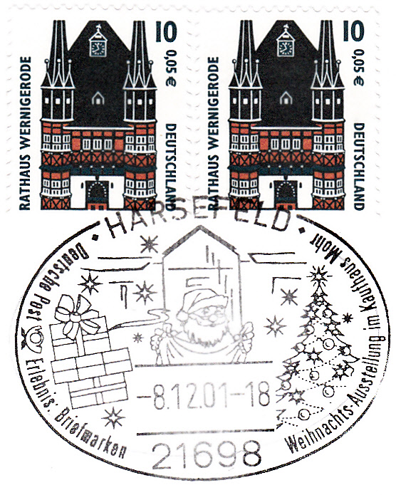 In diesem Sonderstempel vom 8.12.2001 aus Harsefeld wird in der Mitte des Stempels ein Weihnachtsmann gezeigt.