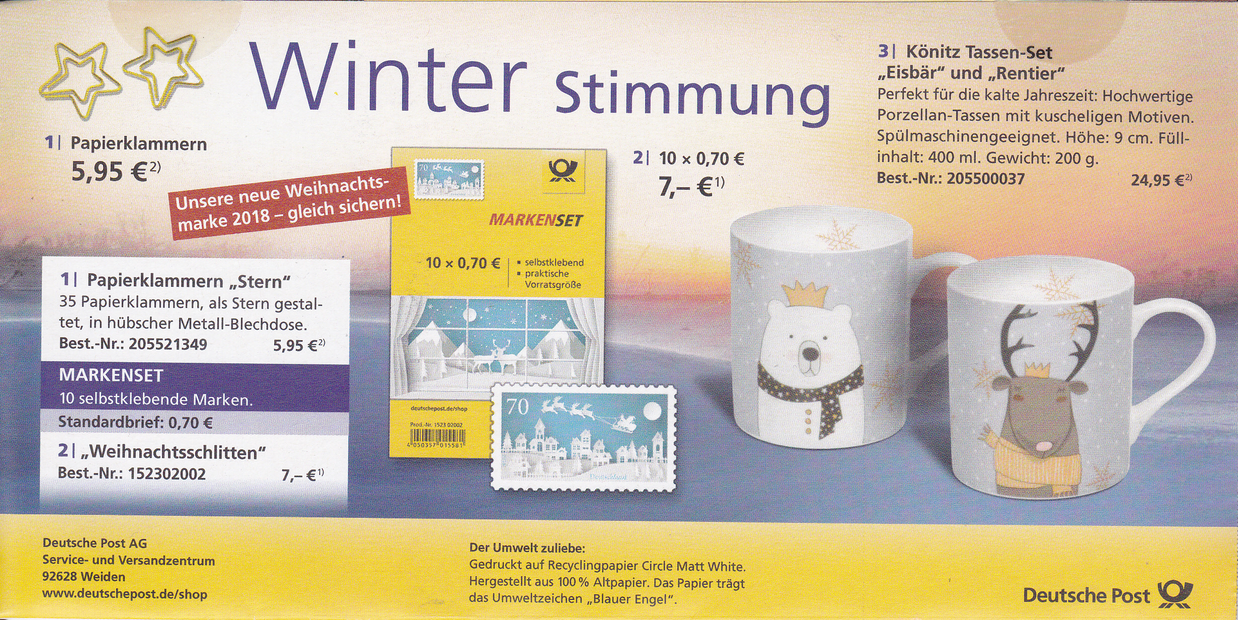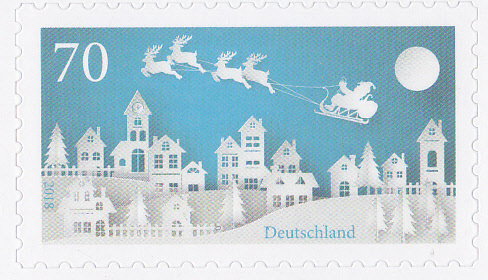 Bei der Post gibt es zur Zeit Plusbriefe mit Wertstempel der 70C-Marke "Winter" mit dem Motiv "Weihnachtsmann im Rentierschlitten über einer Stadt" (MiNr 3421) mit aufgedruckter Zähnung und einer dazu passenden Weihnachtsklappkarte.