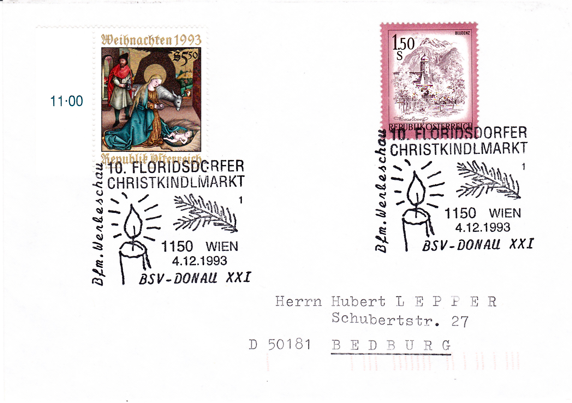 Sonderstempel aus Wien vom 4.12.1993 zum 10. Floridsdorfer Christkindlmarkt mit der Kennziffer "1".