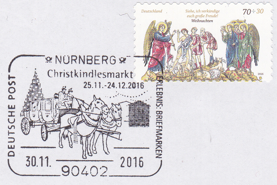 Sonderstempel aus Nürnberg vom 25.11.2016 zur Eröffnung des Nürnberger Christkindlesmarkt 2016. Im Stempelbild sind eine Postkutsche, ein Weihnachtsbaum und Marktbuden zu sehen.