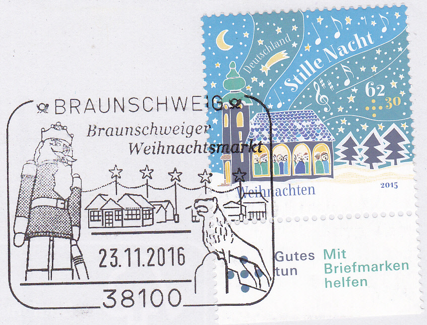 Sonderstempel vom 23.11.2016 aus Braunschweig zum Braunschweiger Weihnachtsmarkt mit einem Nussknacker, Weihnachtsbuden, Weihnachtssternen und dem Braunschweiger Löwen im Stempelbild.
