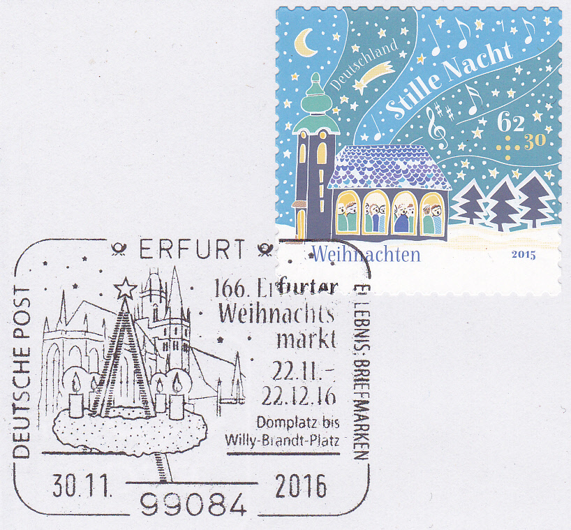 Sonderstempel vom 30.11 2016 aus Erfurt zum 166. Erfurter Weihnachtsmarkt mit der Abbildung des Erfurter Domes und einer Weihnachtspyramide mit Adventskranz.