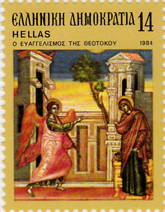 Die Weihnachtsmarken 1984 aus Griechenland zeigen Szenen aus der Allerheiligen-lkone (18. Jh.) von Athanasios Toundas. Hier die Marke zu 14 Drachmen (MiNr 1571) die die Szene "Mariä Verkündigung" zeigt.