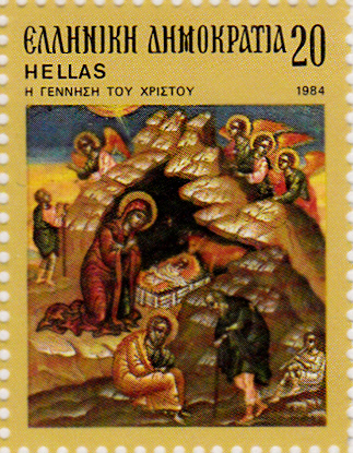 Zur Serie 1984 aus Griechenland gehört auch diese Marke zu 20 Drachmen (MiNr 1572) mit der Szene "Christi Geburt".