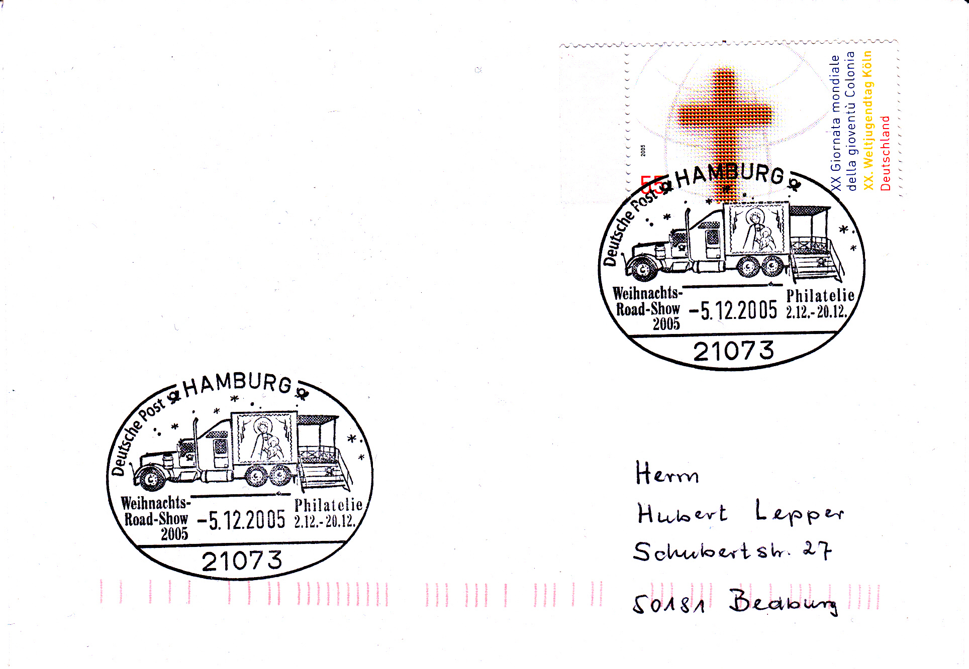 Diese Weihnachts-Road-Show machte offensichtlich am 5.12.2005 in 21073 Hamburg Station, wie dieser Sonderstempel belegt.