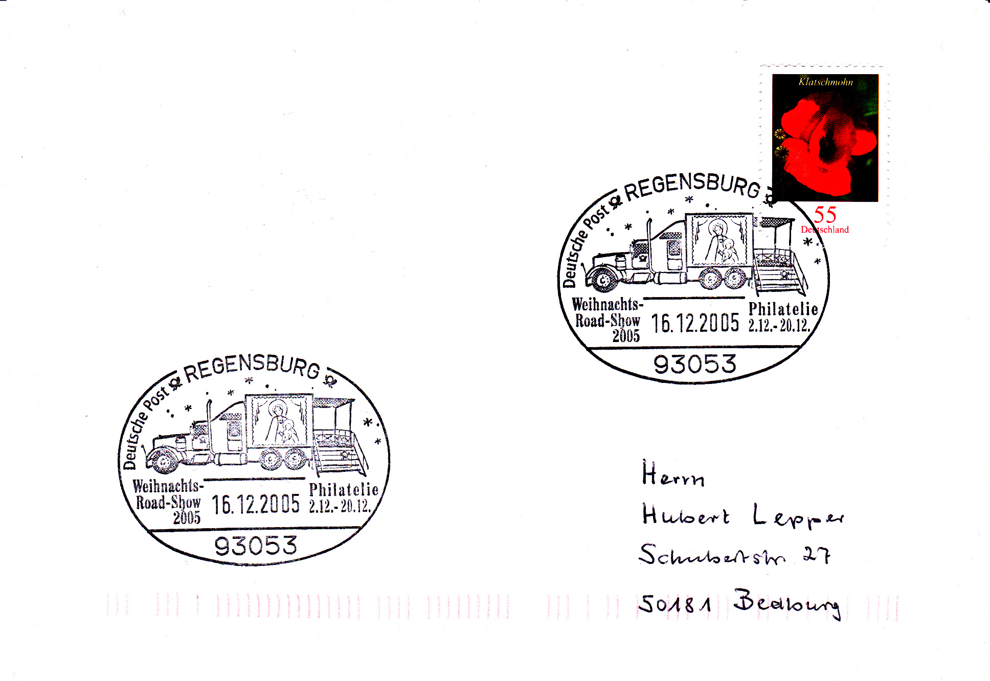 Die Weihnachts-Road-Show war auch in Bayern unterwegs, wie uns der Sonderstempel aus 93053 Regensburg vom 16.12.2005 zeigt. Mir ist allerdings nicht bekannt, ob zwischen Oberhausen (9.12.) und Regensburg noch weitere Stationen lagen.