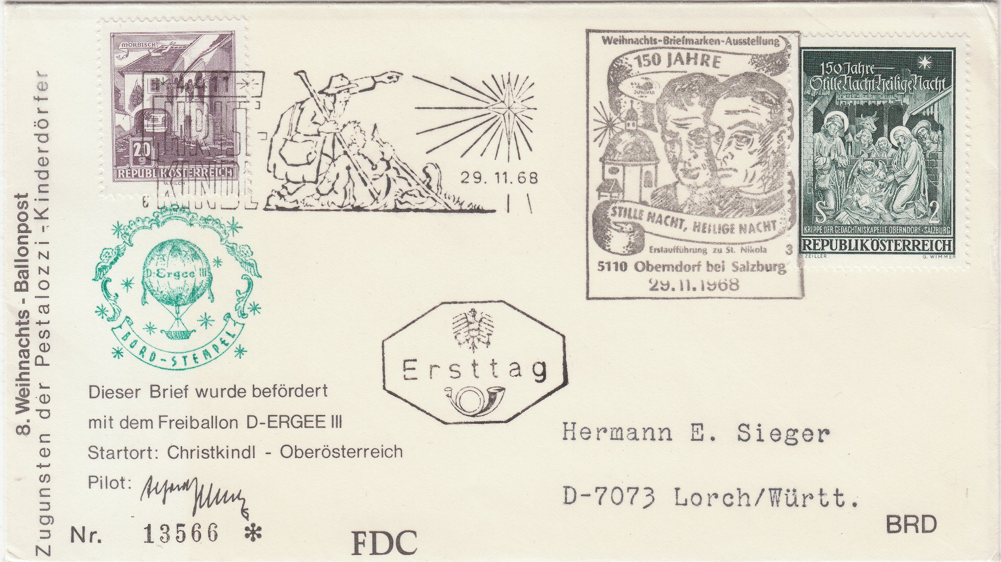 Der Sonderstempel aus Oberndorf weist im Text auf "175 Jahre "Stille Nacht" hin. Wie Rüdiger in einem der vorherigen Beiträge schreibt, ist Oberndorf der "Geburtsort" des Liedes.
