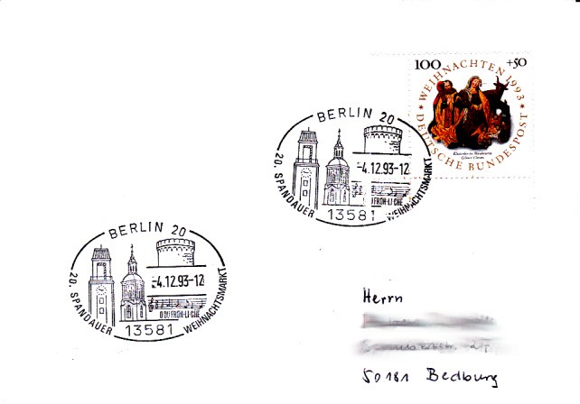 Ein ebenfalls sehr bekanntes Weihnachtslied ist "Oh du Fröhliche". Im Sonderstempel zum 20.Spandauer Weihnachtsmarkt sieht man unter der Datumszeile Noten und Text vom Anfang dieses Weihnachtsliedes.