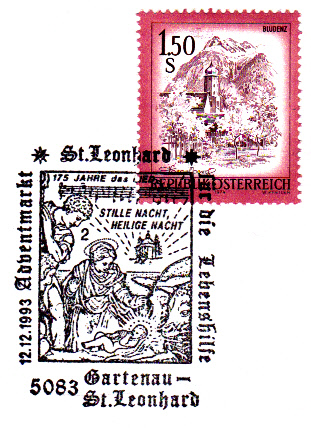 In diesem Sonderstempel aus A-5110 Oberndorf bei Salzburg sind unter anderem Noten und Anfangstext des Weihnachtsliedes "Stille Nacht" abgebildet. Anlass für den Stempel war der 175. "Geburtstag" dieses Liedes.