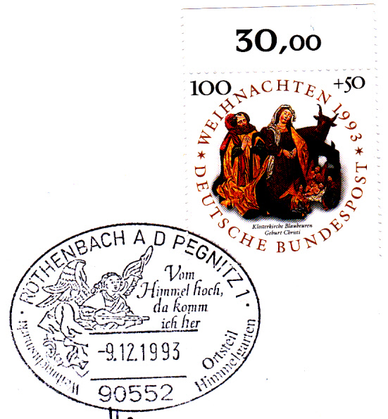 Vom Himmel hoch, da komm ich her ist ein Weihnachtslied von Martin Luther und eine seiner bekanntesten Liedschöpfungen. Der Textanfang des Liedes ist auf diesem Sonderstempel vom 9.12.1993 zum Weihnachtsmarkt in Röthenbach an der Pegnitz Ortsteil Himmelgarten zu lesen.
