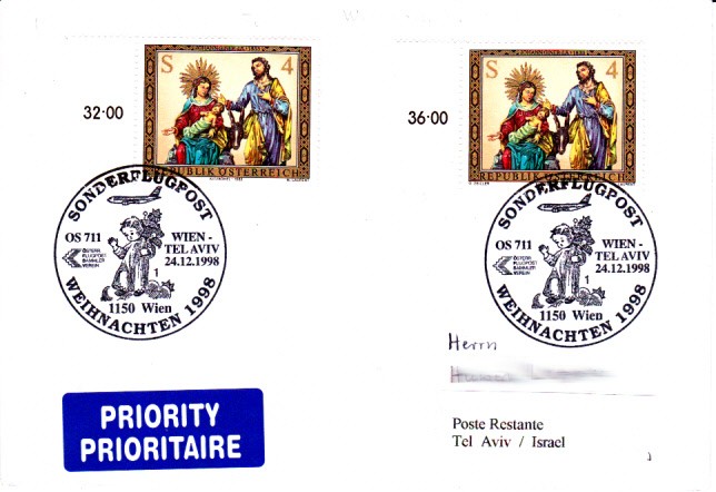 Dieser Brief wurde am 24.12.1998 per "Sonderflugpost" von Wien nach Tel Aviv befördert. Da der Brief einen Empfänger postlagernd adressiert war, wurde er nach der Lagerfrist an den Absender zurückgeschickt.