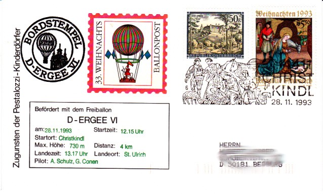 Ein Beleg zur 33. Weinachtsballonpost zu Gunsten der Pestalozzi-Kinderdörfer von Christkidl nach St.Ulrich. Die Briefe wurden mit dem Freiballon D-Ergee VI am 28.11.1993 befördert.