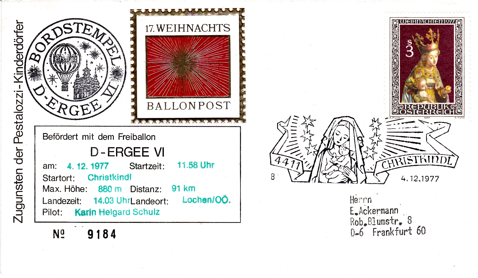 Hier nun ein Beleg zur 17. Weihnachtsballonpost zu Gunsten der Pestalozzi-Kinderdörfer von Christkidl nach Lochen. Die Briefe wurden mit dem Freiballon D-Ergee VI am 04.12.1977 befördert.