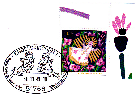 Sonderstempel vom 30.11.1998 aus Engelskirchen, wo sollen die Weihnachtsengel sonst wohnen, mit der Abbildung zweier Engel mit ihren Instrumenten.