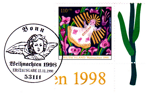 Ersttagssonderstempel aus Bonn zu den Weihnachtsmarken 1998 mit Abbildung eines Engelkopfes.