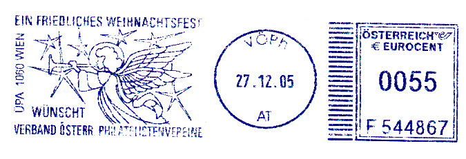 Absenderfreistempel des VÖPhV vom 27.12.2005 mit einem Engel und Weihnachtswünschen.