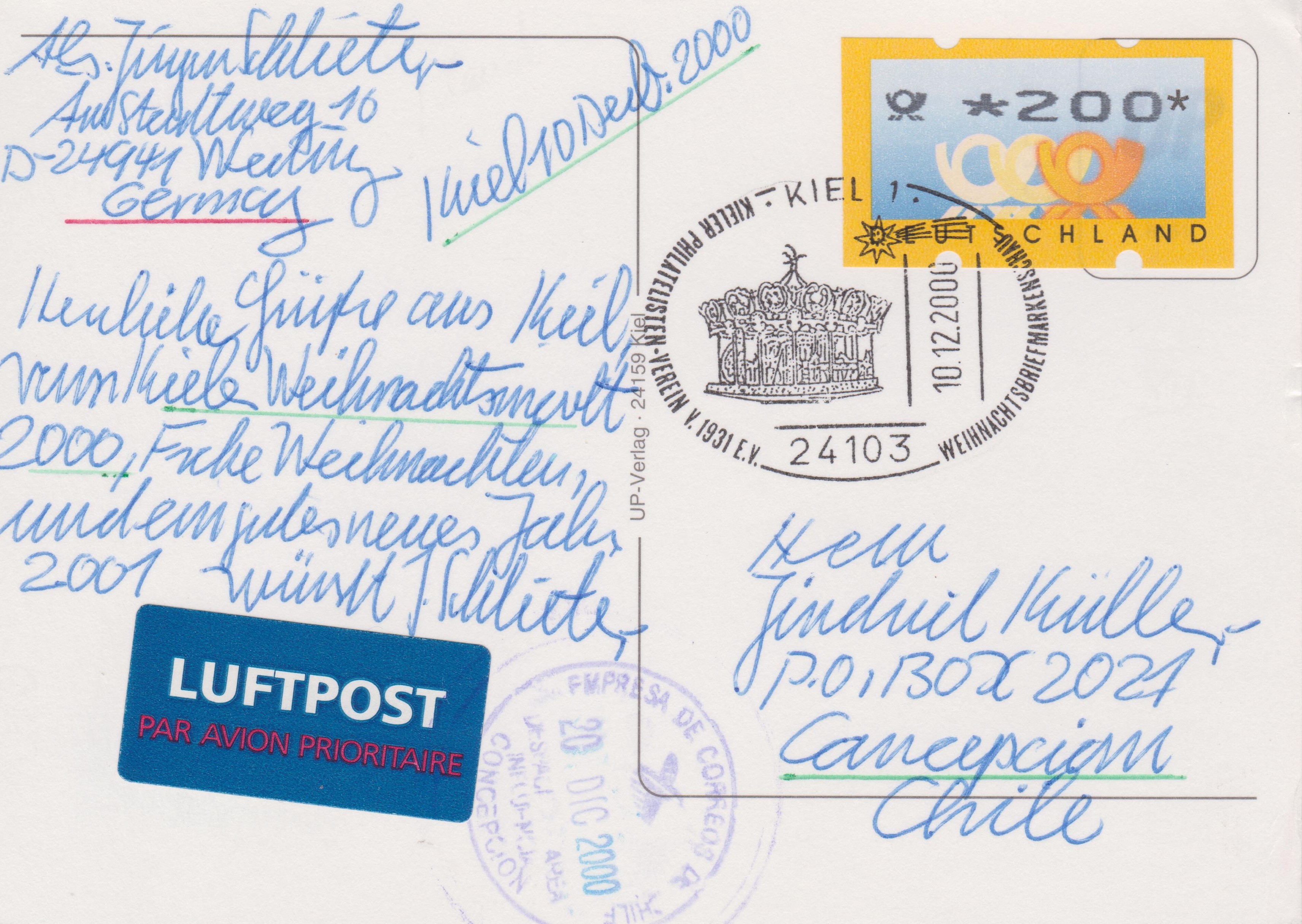 Ansichtskarte, adressiert nach Chile, frankiert am 10.12.2000 per Einzelfrankatur ATM MiNr. 3.2 der Wertstufe 200 Pf, entwertet mit Sonderstempel "24103 KIEL 1 - WEIHNACHTSBRIEFMARKENSCHAU":