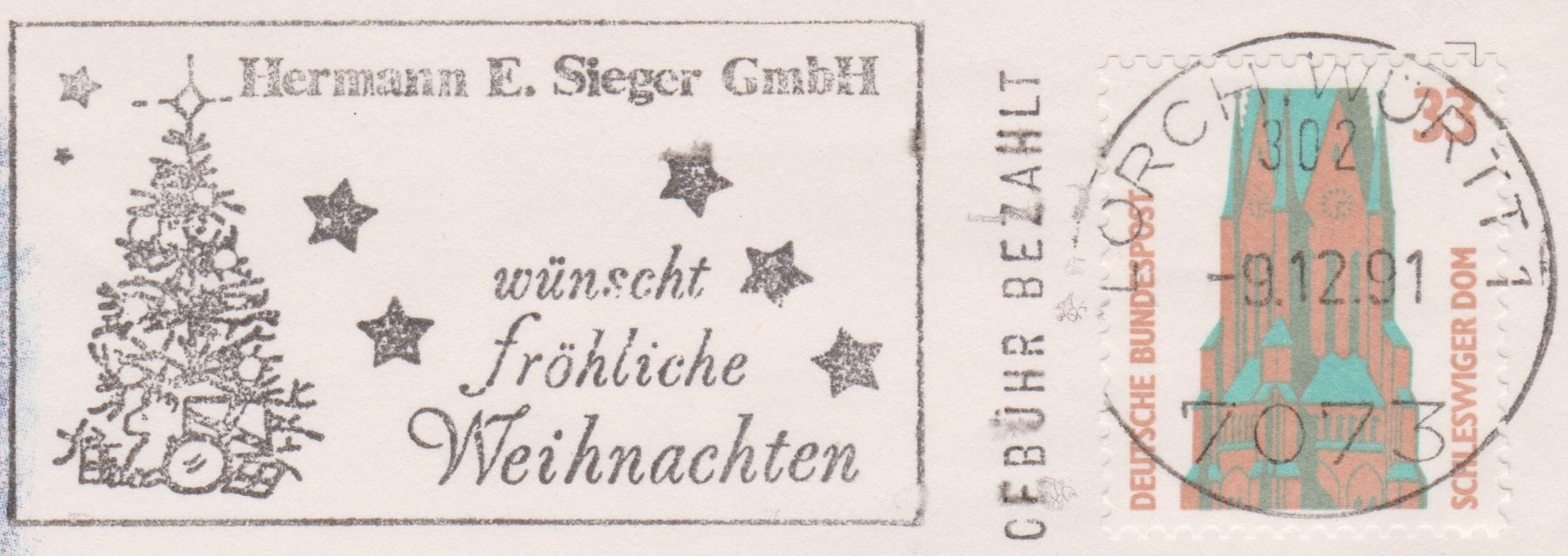 Maschinenstempel "Gebühr bezahlt" der Firma Sieger mit Werbeeinsatz mit einem Weihnachtsbaum als Motiv: