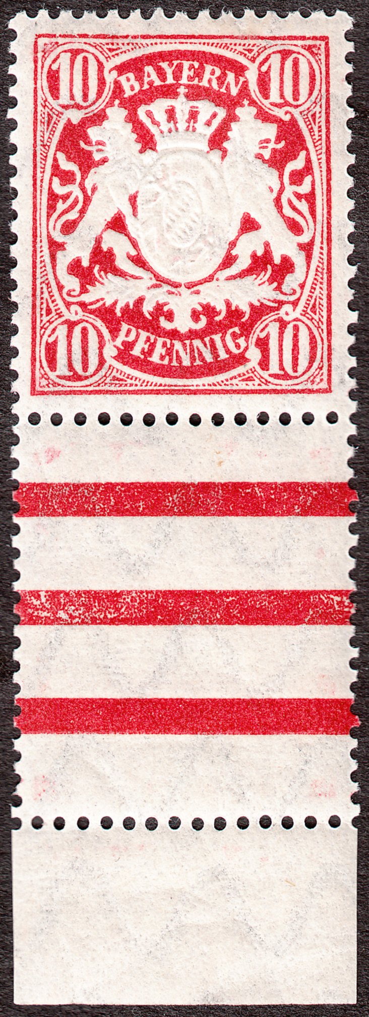 Hier ein Exemplar der Wertststufe zu 10 Pfennig mit Bogenrandfeld unten wie ein Zwischensteg der Type II, katalogisiert als MiNr. 56 B y L: