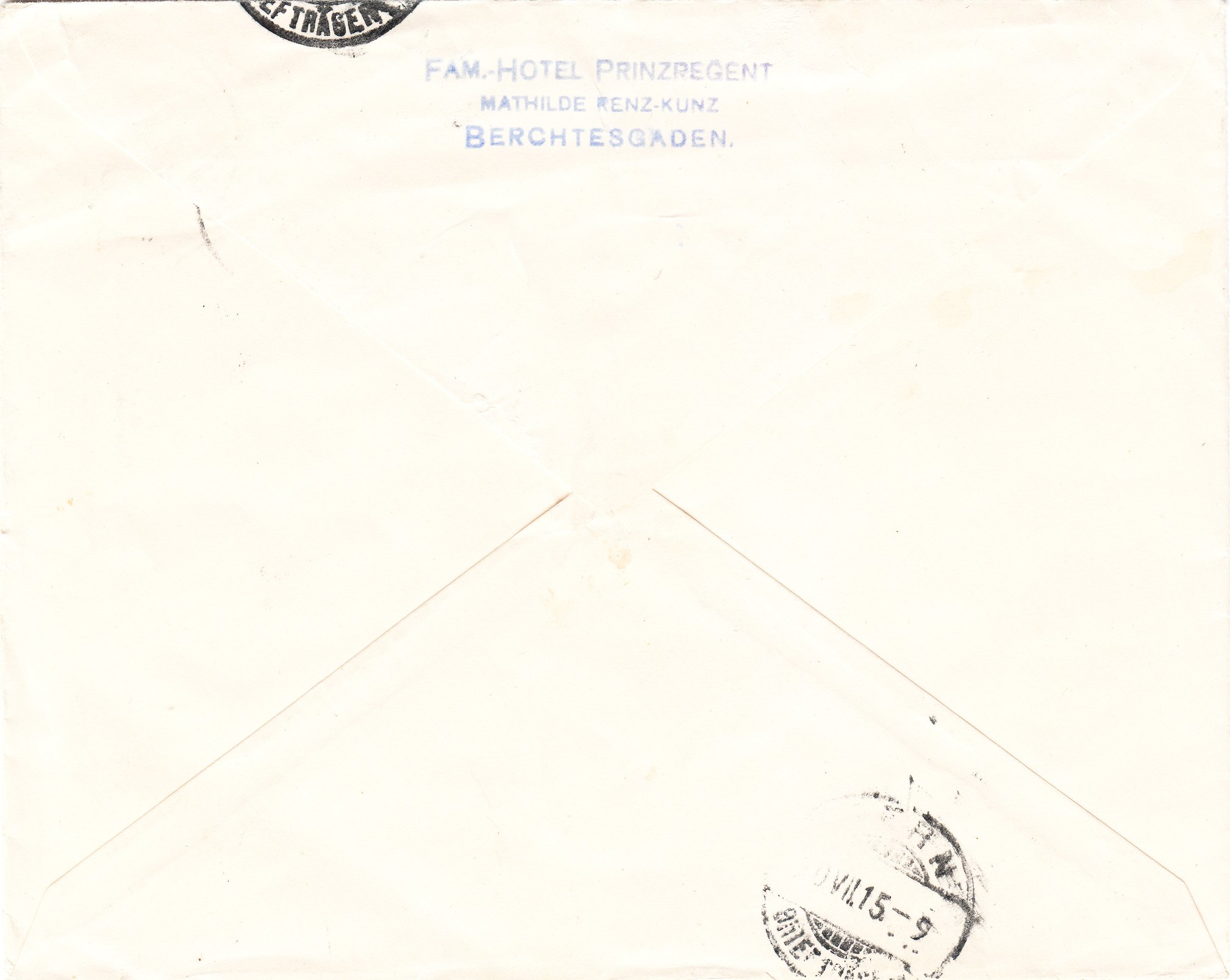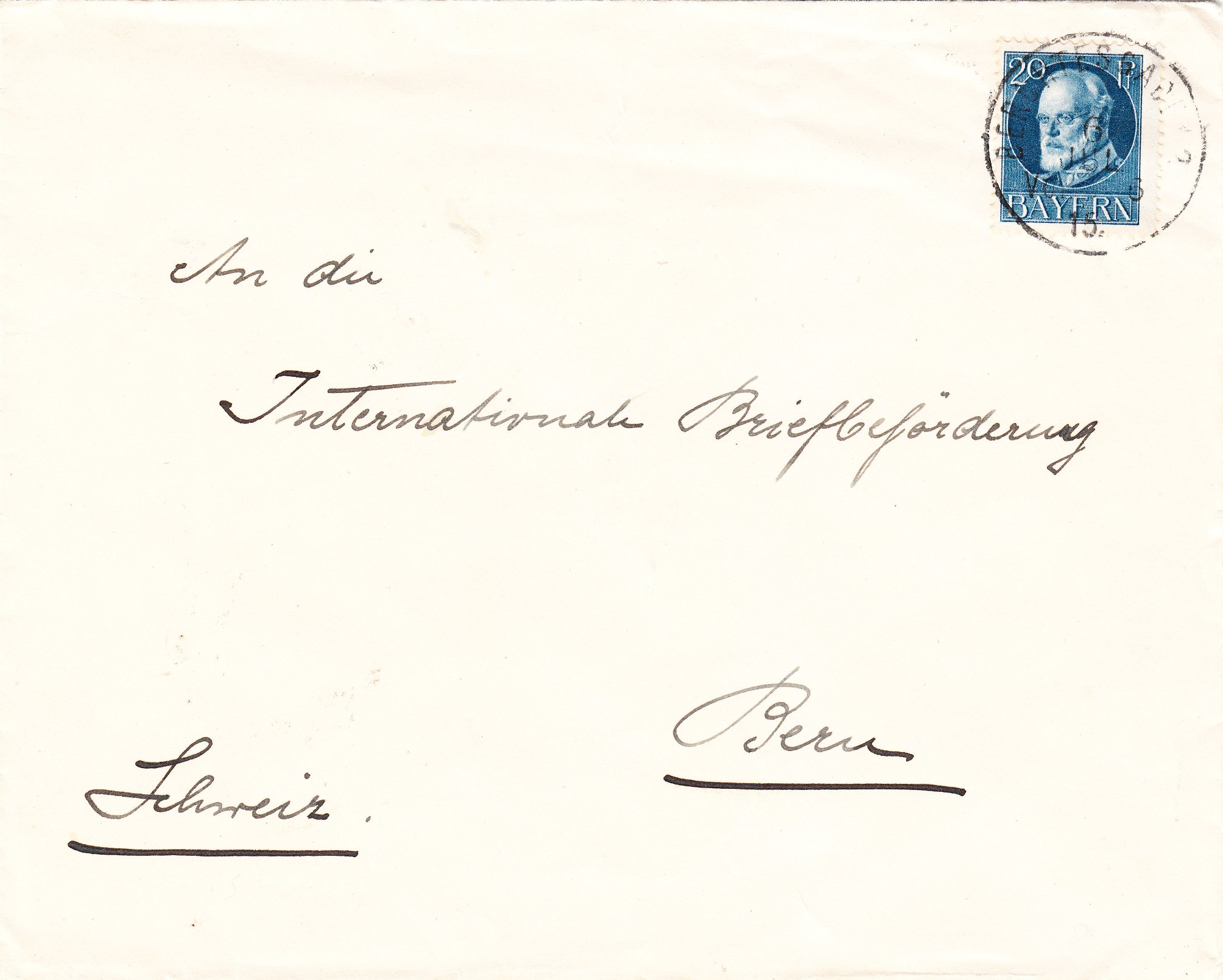 Dieser nach Bern in der Schweiz adressierte, am 06.07.1915 in Berchtesgaden aufgegebene Beleg wurde als Einzelfrankatur mit einer MiNr. 97 I a portorichtig frankiert: