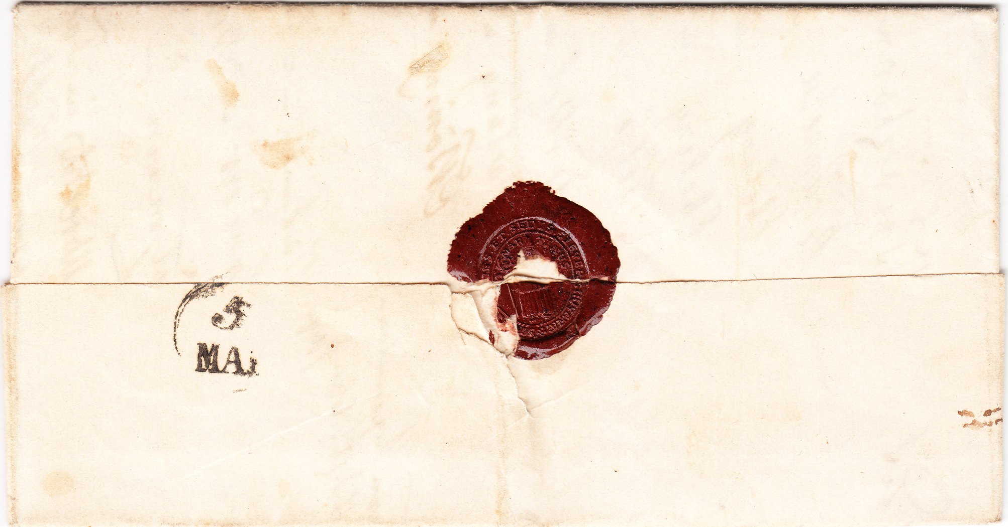 Rücksseitig findet sich ein Einkreisstempel als Ankunftsstempel "5 MAI" mit einer kursiv stehenden "5".