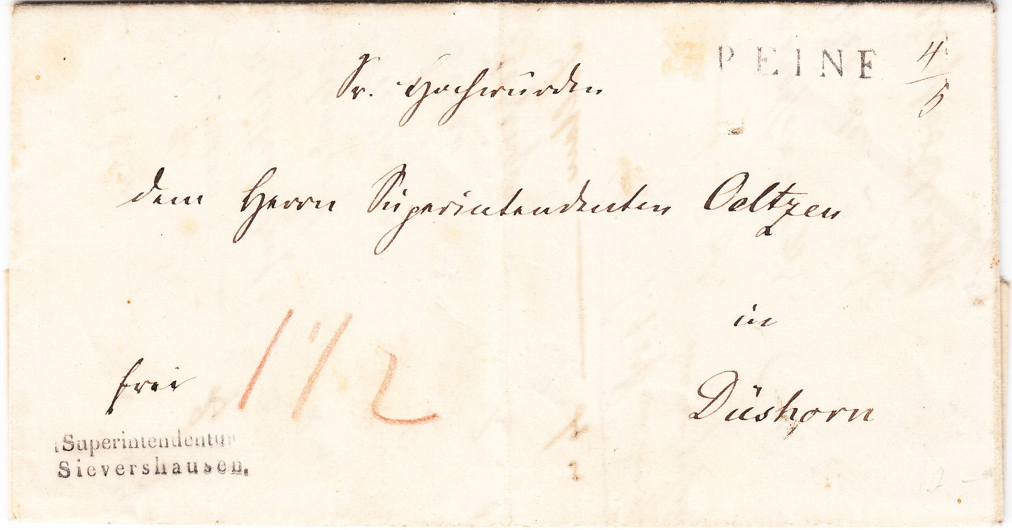 Am 04.05.1850 wurde der an "Seiner Hochwürden dem Herrn Superintendenten Oeltzen in Düshorn" adressierte Beleg in Peine bei der Post aufgegeben, wo ein bei Feuser ab 1808 nachgewiesener, als "2710-1" katalogisierter Langstempel "P E I N E" abgeschlagen sowie handschriftlich das Datum "4/5" vermerkt wurde: