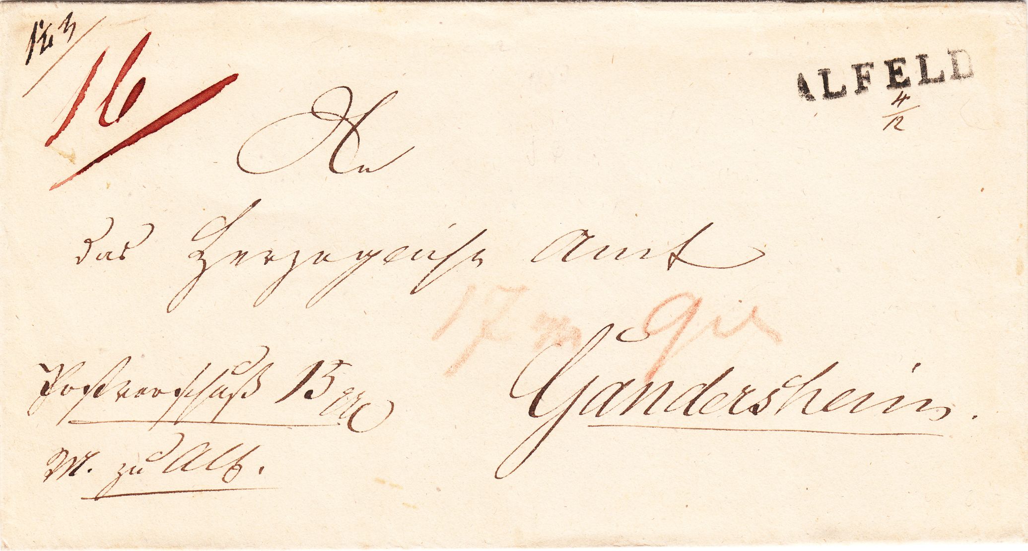 Dieser "1 1/4" Loth schwere, "An das Herzogliche Amt Gandersheim" adressierte Brief wurde an einem 04.12. in dem zum Königreich Hannover gehörigen ALFELD aufgegeben: