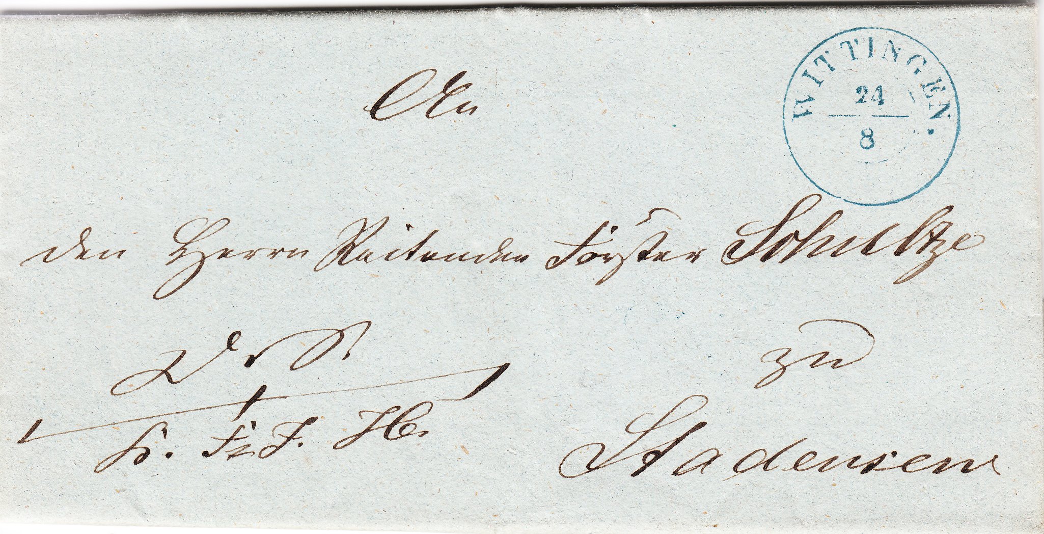 Dieser am 24.08.1855 von der "Königlichen Forst-Inspection Hankensbüttel" geschriebene Brief wurde am 24.08.1855 in WITTINGEN aufgegeben und erhielt dort den üblichen Zweikreisstempel in Antiquaschrift in Blau: