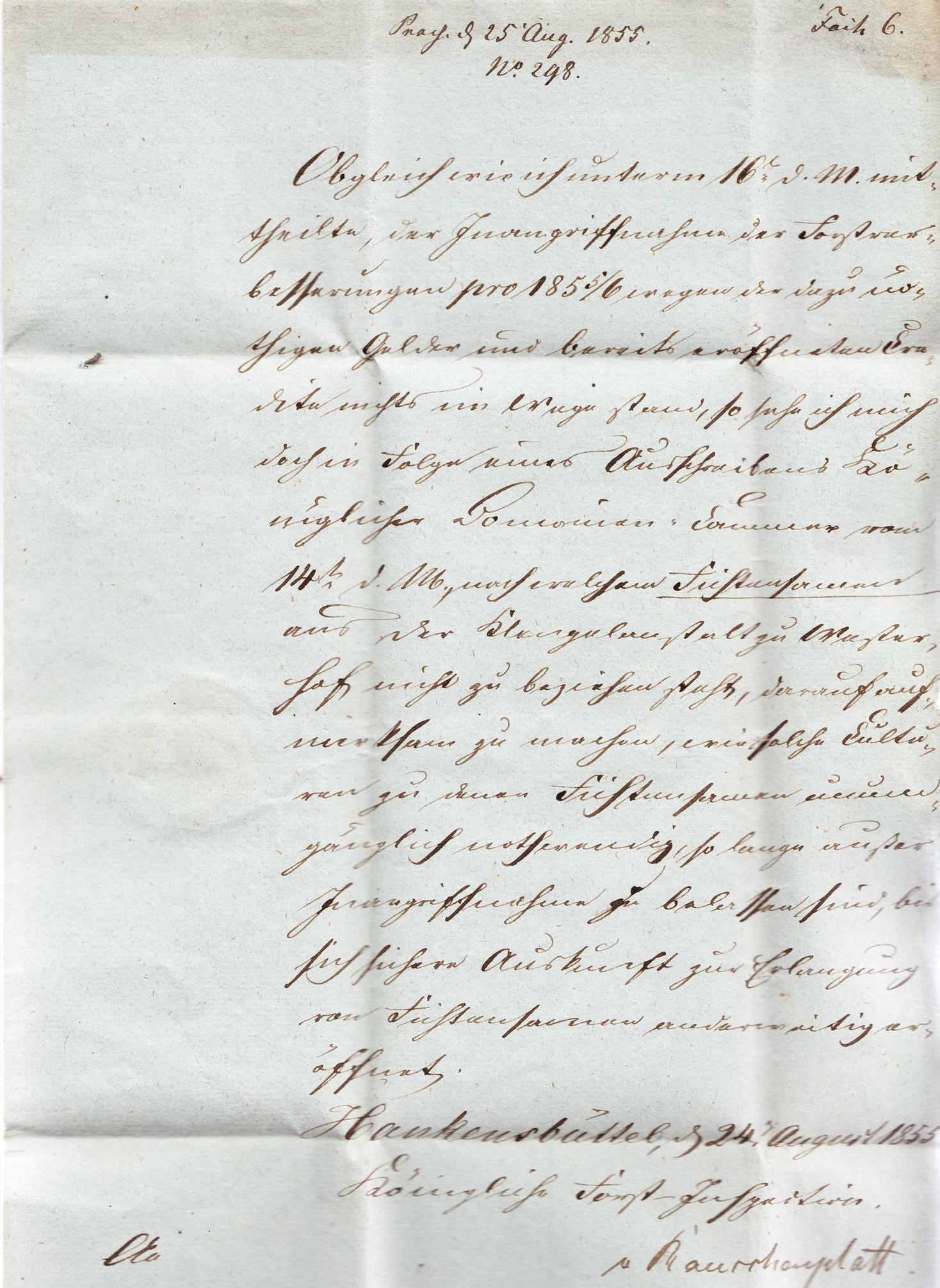 Dieser am 24.08.1855 von der "Königlichen Forst-Inspection Hankensbüttel" geschriebene Brief wurde am 24.08.1855 in WITTINGEN aufgegeben und erhielt dort den üblichen Zweikreisstempel in Antiquaschrift in Blau: