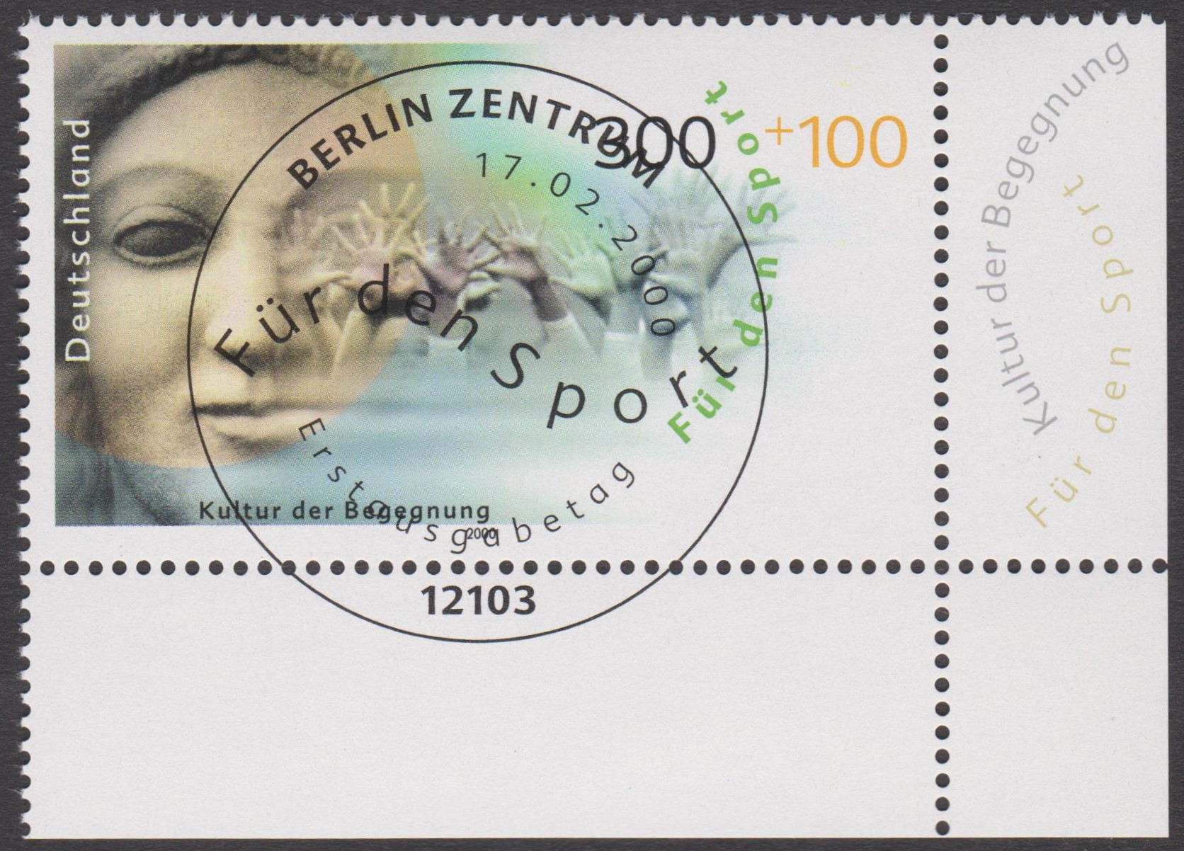 Bund MiNr. 2097 steht unter dem Motto "Kultur der Bewegung", hier als linke untere Bogenecke des Zehnerbogens mit ESST BERLIN: