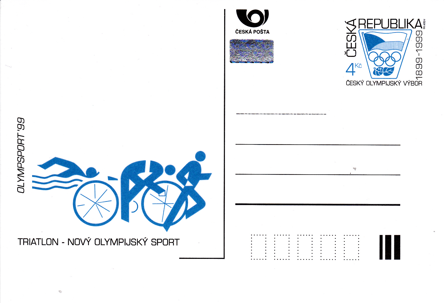 Postkarte "Triathlon - die neue olympische Sportart" aus der Tschechischen Republik mit einem Wertstempel "100 Jahre Nationales Olympisches Komitee" zu 4 Kronen.