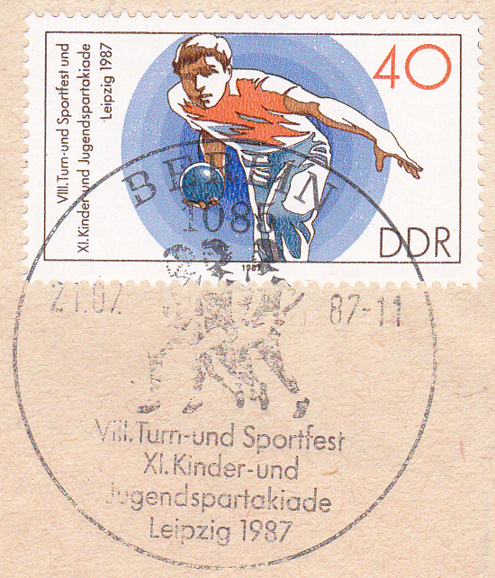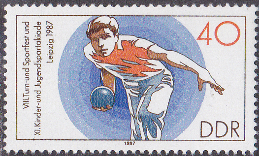 Einen Kegler kurz vor dem Werfen der Kugel sehen wir auf dieser Marke der DDR (MiNr 3115).