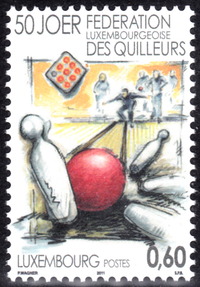 Zum Jubiläum "50 Jahre Luxemburgischer Verband der Kegelspieler" ist in Luxemburg diese Marke (MiNr v1902) mit der Abbildung von fallenden Kegel und einer Kegelgruppe an einer Kegelbahn erschienen.