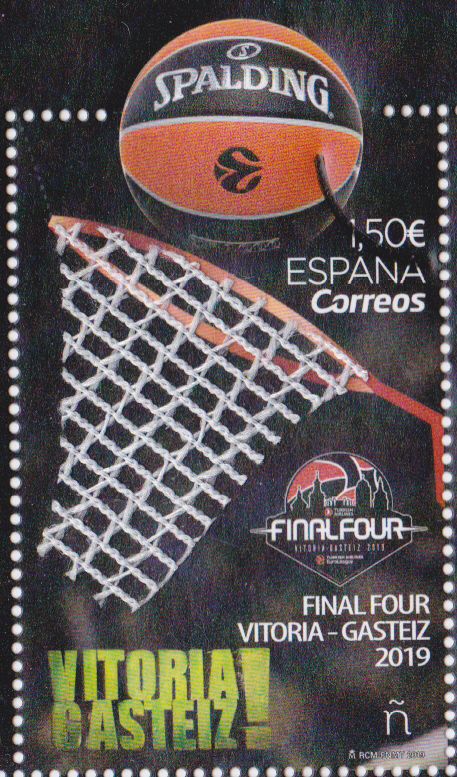 Zum Final Four der Basketball EuroLeague 2018/19 in Vitoria-Gasteiz erschien in Spanien diese Marke (MiNr 5354) mit einem Basketball, einem Basketballkorb mit aufgeklebtem Netz und dem Emblem der Veranstaltung. Die Marke erschien in einem Bogen mit sechs Marken.